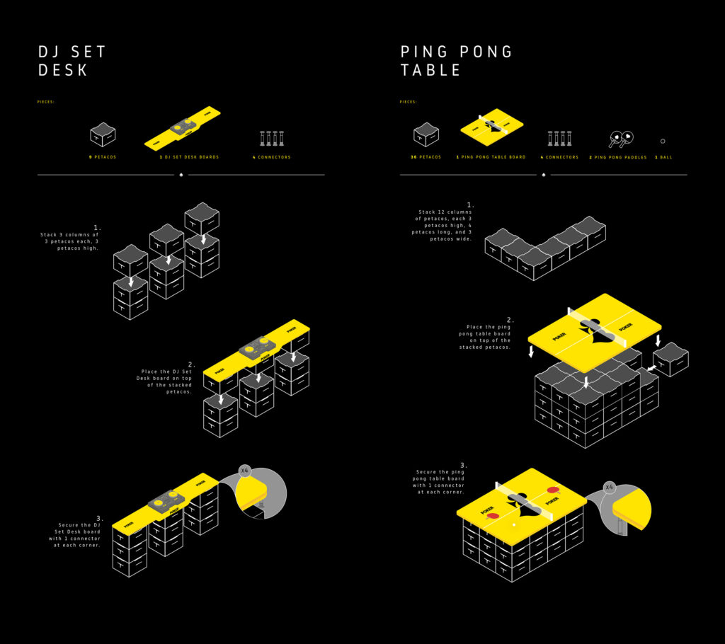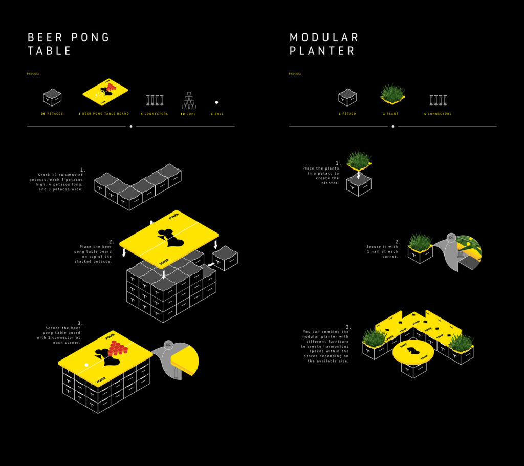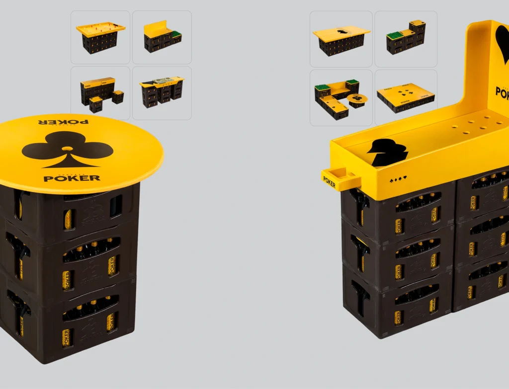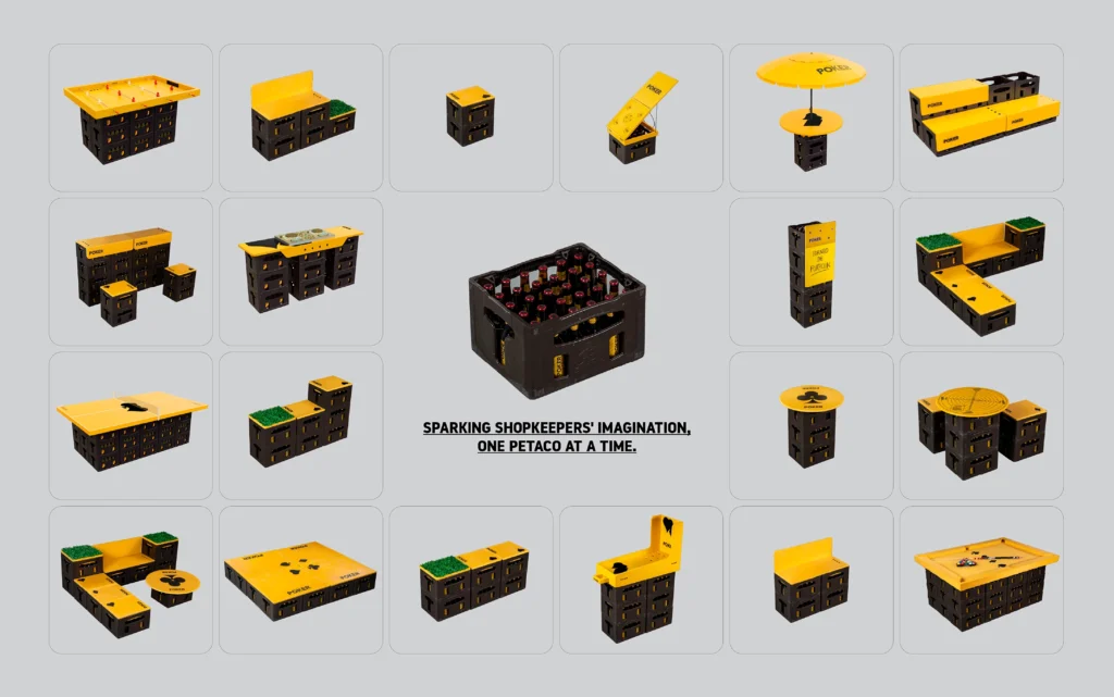 Inspired by a completely modular design system, IMAGINE WITH PETACOS transformed beer crates accumulated in stores into functional furniture that adapts to any space. From tables and chairs of various sizes to entertainment areas like stages and DJ sets, to games for friends like billiards, foosball, and even basketball courts, we are transforming stores into entertainment centers, attracting friends and inviting them to stay longer, thereby increasing store owners’ revenue and our volume in that channel. The process for acquiring the necessary elements to transform PETACO into this functional furniture is through BEES, our B2B platform.