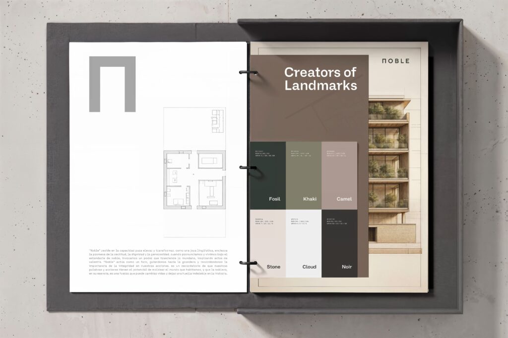 NOBLE’s new identity is based on an essential premise: doors and portals as metaphors for origin, openness, and transcendence in architecture. Inspired by geometric purity and the nobility of materials, the brand redefines its visual presence with a symbol that acts as an architectural signature, an authorial seal that enshrines each project as a unique work. The Π symbol—reinterpreted as a contemporary portal—evokes the balance between structure and meaning, between technique and emotion. The visual system, with its mineral tones and tactile texture, projects serenity, precision, and permanence. Each piece, from paper to concrete, embodies the studio’s constructive rigor and restrained elegance. More than a logo, NOBLE is a statement of purpose: to create spaces that dignify human life and celebrate the beauty of the architectural process. With a “Marketing-first-architecture” approach, the identity embraces innovation without sacrificing integrity, connecting art, design, and purpose. Thus, NOBLE stands as a creator of landmarks —“Creators of Landmarks”—, guided by the light of honesty, greatness and generosity.